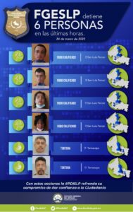 SLP. La Fiscalía General del Estado (FGE) detuvo en las últimas horas, a seis personas por medio del cumplimiento de Órdenes de aprehensión por los delitos de robo calificado y tortura, respectivamente.
