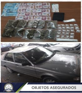 Mientras que en el interior del automóvil fue encontrada una báscula tipo gramera en color negro, además de 10 billetes con la denominación de 50 pesos y 4 billetes con la denominación de 20 pesos, además de 40 bolsitas de plástico vacías y sobre el asiento del piloto, se apreció otros 5 envoltorios conteniendo en su interior hierba verde y seca con las características físicas a la droga conocida como marihuana.