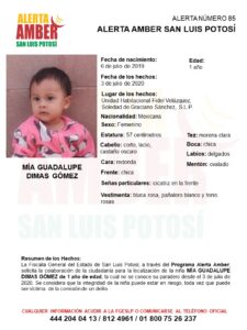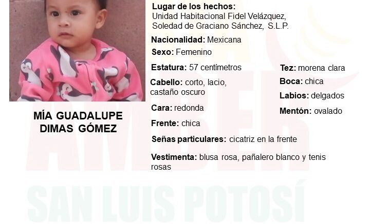 SLP. – La Fiscalía General del Estado de San Luis Potosí (FGESLP) activó una Alerta Amber para apoyar a la localización de la menor Mía Guadalupe Dimas Gómez de 1 año de edad, originaria del municipio de Soledad de Graciano Sánchez.