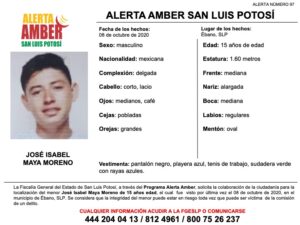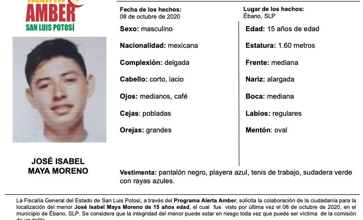 SLP. – La Fiscalía General del Estado de San Luis Potosí (FGESLP), activó una Alerta Amber para localizar a un menor de 15 años de edad, de nombre José Isabel Maya Moreno, quien fue visto por última vez en la colonia Las Américas perteneciente al municipio de Ébano.