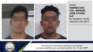 SLP. – En seguimiento a las investigaciones del caso de la mujer que fue privada de la vida el pasado 18 de agosto del año en curso, quien muriera en un hospital de la capital a causa de las quemaduras que presentaba en su cuerpo, la Fiscalía General del Estado (FGESLP) a través de elementos de la Policía de Investigación (PDI) detuvieron a dos personas más por su probable participación en esos hechos.
