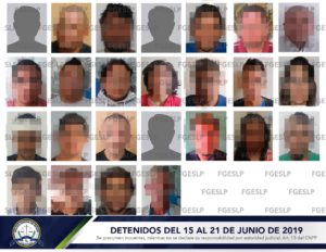 SLP. – La Fiscalía General del Estado de San Luis Potosí (FGESLP), a través de su Policía de Investigación (PDI), cumplimentó 18 órdenes de aprehensión, tres órdenes de reaprehensión y detuvo a cuatro personas en flagrancia, lo que suma un total de 25 personas aseguradas en el periodo que comprende del domingo 16 al sábado 22 de junio del año en curso.
