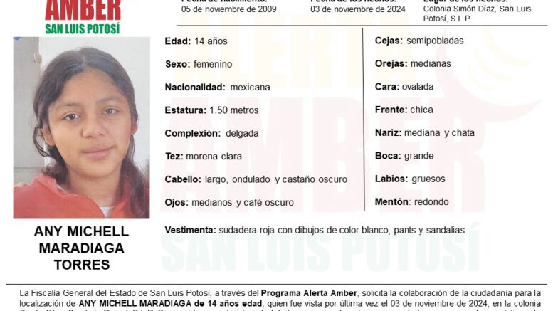 La Fiscalía General del Estado de San Luis Potosí (FGESLP) activó una Alerta Amber para ubicar a Any Michell Maradiaga Torres, una adolescente de 14 años de edad.