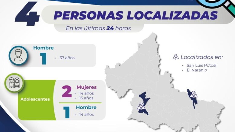 La Fiscalía General del Estado de San Luis Potosí (FGESLP) a través de elementos de la Policía de Investigación (PDI) adscritos a la Fiscalía Especializada en Derechos Humanos, localizó a cuatro personas que contaban con fichas de búsqueda activas en el estado.