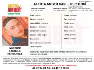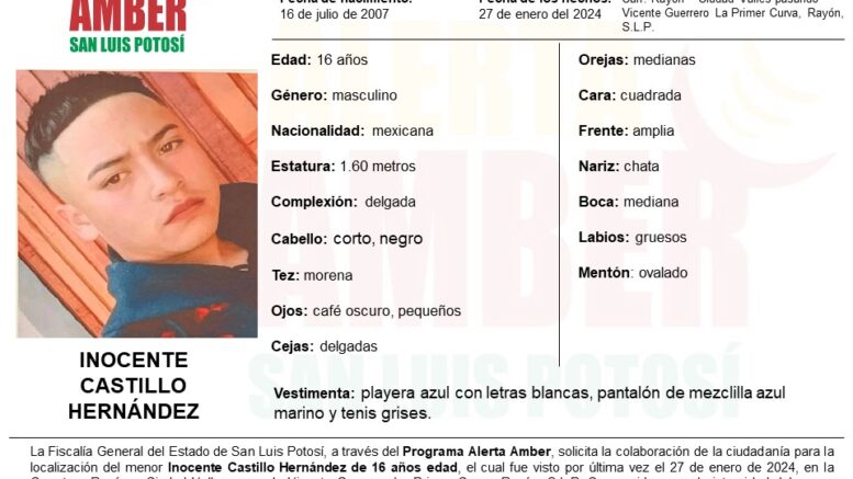 Este miércoles 7 de febrero, la Fiscalía General del Estado de San Luis Potosí (FGESLP) activó una ficha de Alerta Amber para localizar a un adolescente de 16 años.