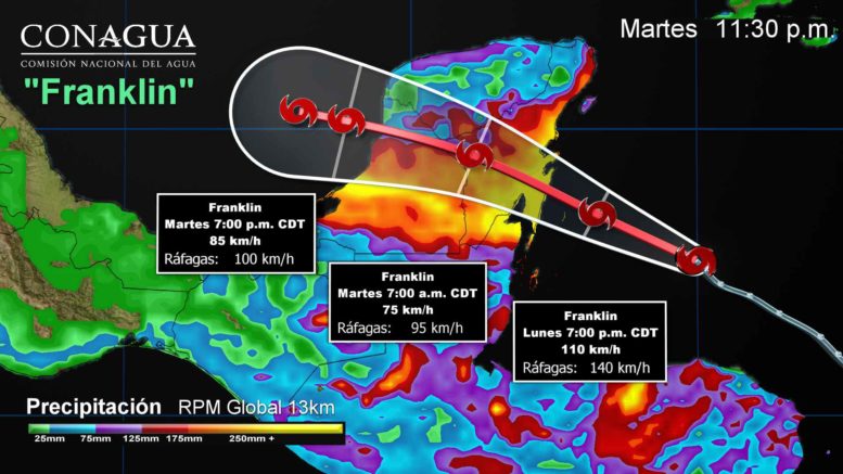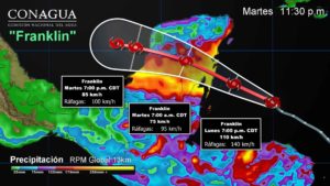 NOTA: La Tormenta Tropical “Franklin, impactó aproximadamente a las 01:00 h de este martes, en la Península de Yucatán, al noreste de Chetumal, Q. Roo, entre Puerto Herrero y Puerto Costa Maya, Q. Roo