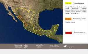 Intervalos de chubascos con tormentas puntuales fuertes (25 a 50 mm): Chihuahua, Coahuila, Nuevo León, Durango, Sinaloa, Nayarit, Jalisco, Colima, Michoacán, Guanajuato, Ciudad de México, Morelos, Campeche, Yucatán y Quintana Roo.