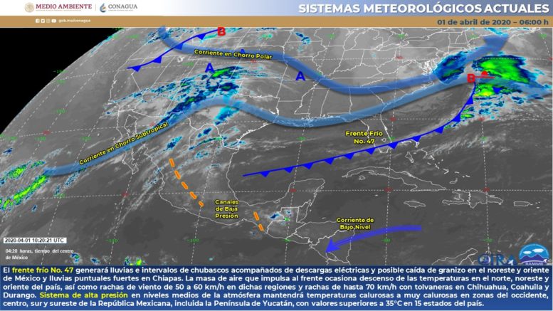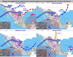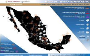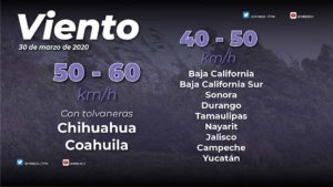 Mesa del Norte: Cielo nublado con intervalos de chubascos en Coahuila, Nuevo León y San Luis Potosí, así como lluvias aisladas en Zacatecas. Ambiente templado durante el día. Viento de dirección variable de 15 a 30 km/h en la región con rachas de 60 a 70 km/h y tolvaneras en Chihuahua, Coahuila y Durango, y rachas de hasta 60 km/h en el resto de la región.