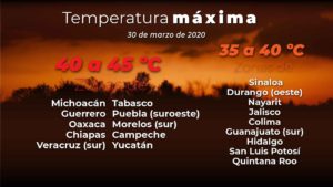 Temperaturas máximas de 40°C a 45°C: Michoacán, Guerrero, Morelos (sur), Puebla (suroeste), Campeche y Yucatán.