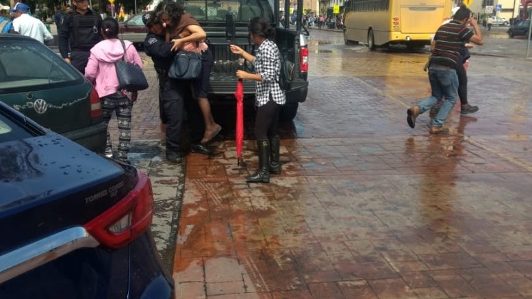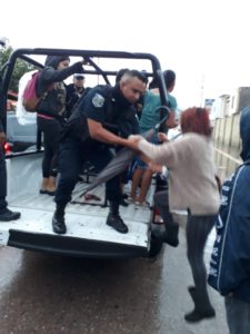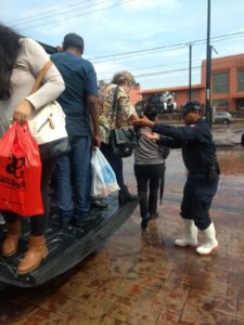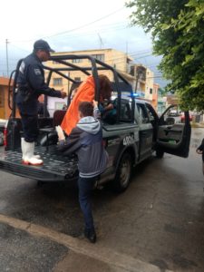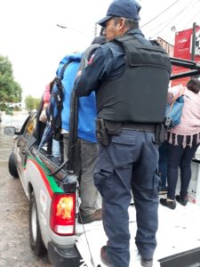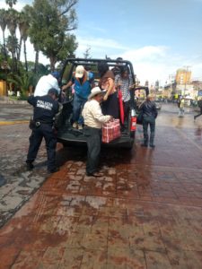 Policía Metropolitana abordo de camionetas ayuda a habitantes de Privada de las Haciendas a poder salir de su fraccionamiento debido a las inundaciones en las que se vio afectado impidiendo poder salir a pie a tomar diferentes rutas de transporte