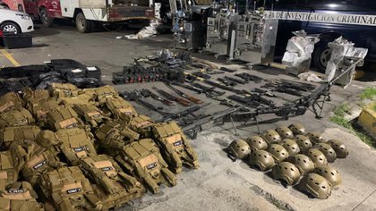 También fueron decomisados seis aditamentos lanzagranadas, 4 mil cartuchos de diferentes calibres, cuatro granadas de humo, 12 granadas de gas, cuatro granadas de calibre específico; 250 cargadores de diversos calibres, tres espadas de acero, 116 chalecos balísticos, 28 placas, presumiblemente con las iniciales CJNG, 17 cascos tácticos y un inhibidor de señal de telecomunicaciones.