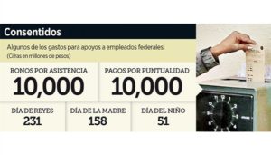 El que un burócrata llegue a tiempo le cuesta al Gobierno federal 10 mil 885 millones de pesos. También existen pagos por “asiduidad” y por perseverancia, conceptos en los que se gastaron 10 millones 505 mil pesos y mil 223 millones 98 mil pesos, respectivamente.