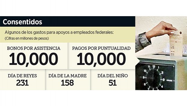 Mantener alegres a los burócratas del Gobierno federal cuesta 29 mil millones de pesos. Por ejemplo, el costo del bono por asistencia para los burócratas en 2016 ascendió a 10 mil 99 millones de pesos, monto superior al que presumen varios programas de cultura o educación.