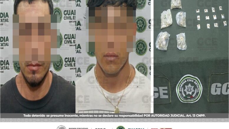 Santa María del Río, S.L.P.- En el marco de las acciones para inhibir la venta de narcóticos en el territorio potosino, efectivos de la Guardia Civil Estatal (GCE) detuvieron a dos hombres, por probable posesión de estupefacientes, con fines de venta.