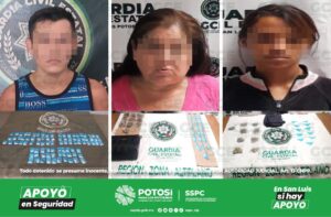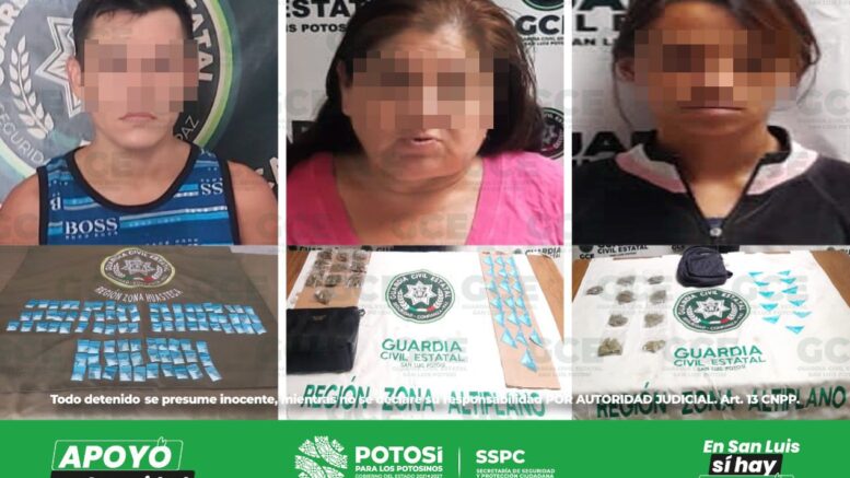 S.L.P.- Mediante las tareas de análisis e inteligencia que son efectuadas por policías de la Guardia Civil Estatal (GCE) tres personas resultaron detenidas y señaladas como probables vendedores de droga; derivado de estos hechos se aseguraron 79 dosis de narcóticos.