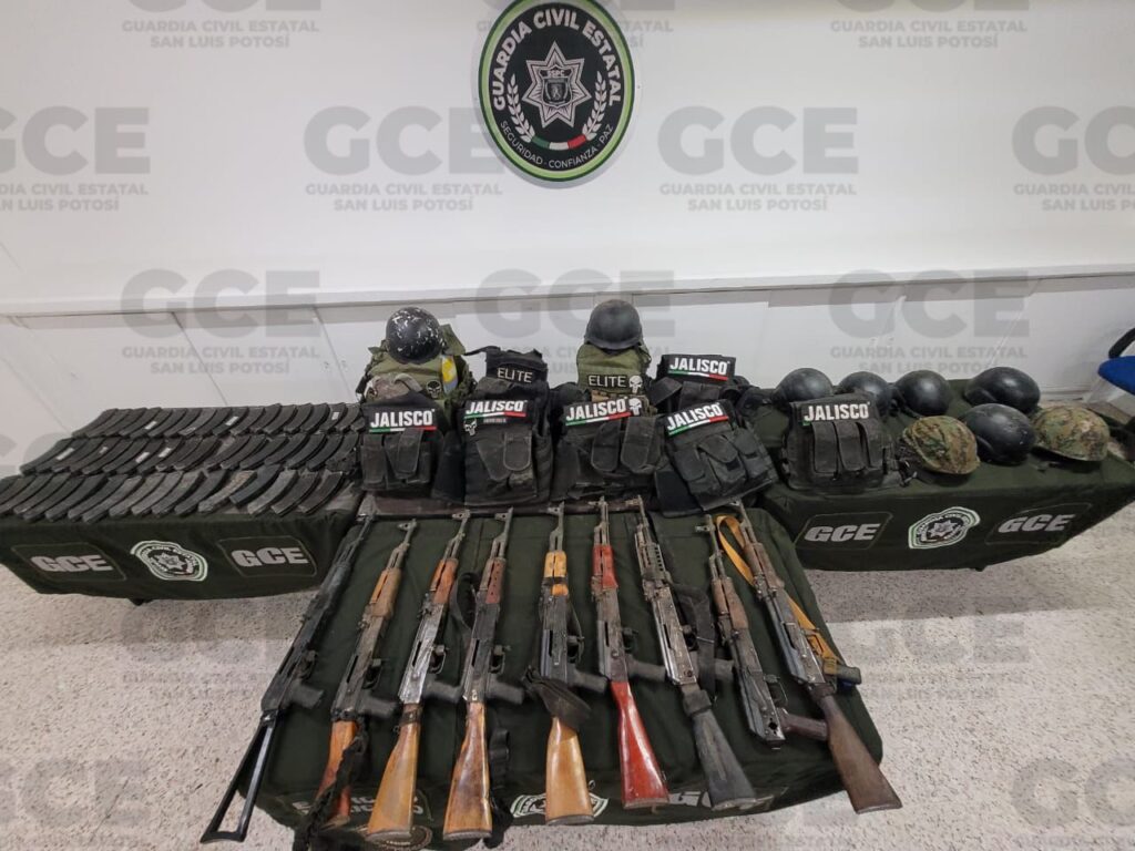 GCE asegura arsenal de 9 fusiles AK-47, cargadores y equipo táctico en Villa de Reyes