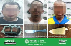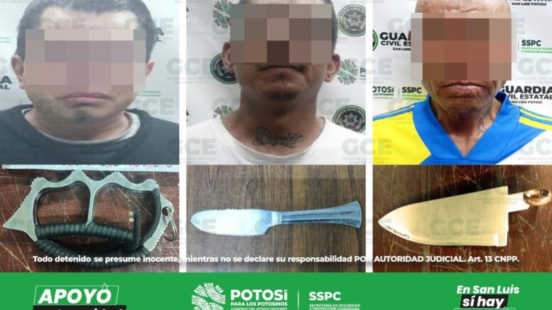 San Luis Potosí, S.L.P.- En distintos operativos de seguridad y vigilancia, desarrollados por elementos de la Guardia Civil Estatal (GCE), tres individuos fueron detenidos después de que las autoridades los sorprendieran en supuesta posesión de armas prohibidas.