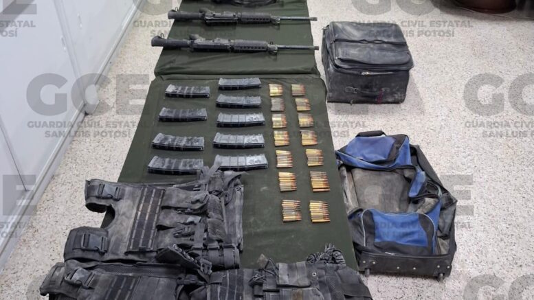 Cedral, S.L.P.- Como parte de los operativos conjuntos entre la Guardia Civil Estatal (GCE) y la Secretaría de la Defensa Nacional (SEDENA) en la región Altiplano, se logró el aseguramiento de armas de fuego, cargadores, cartuchos útiles y equipo táctico tras dar seguimiento a la presencia de individuos armados en la zona.