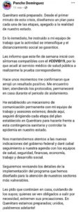 Les pido que continúen en casa, cuidando de los suyos; quienes se ven obligados a salir por necesidad, extremen sus precauciones. En Querétaro estamos preparados; unidos, ¡saldremos adelante!”