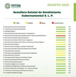 En su búsqueda constante por la mejora de la administración estatal, el Gobernador de San Luis Potosí, Ricardo Gallardo Cardona, ha dado a conocer los resultados del Semáforo de Rendimiento Gubernamental correspondiente al mes de agosto. Esta herramienta de evaluación tiene como objetivo medir el desempeño de los funcionarios y las dependencias gubernamentales, reafirmando el compromiso de abordar las necesidades más urgentes de la población y continuar con la transformación del estado.