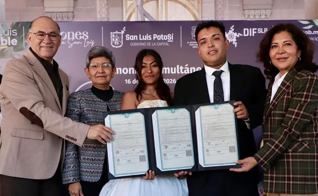 - En la Plaza de Armas, el Alcalde Enrique Galindo Ceballos y la Presidenta del DIF Municipal, Estela Arriaga Márquez, fungieron como testigos de honor en el matrimonio civil de 217 nuevas parejas, en una ceremonia para fortalecer a las familias de San Luis Capital.