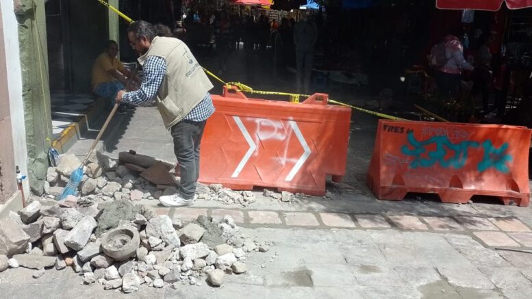 Personal de la Unidad de Gestión del Centro Histórico (UGCH), en coordinación con Interapas, realizó trabajos de mantenimiento en el Mercado de los Huaracheros, tras la reparación de una fuga.