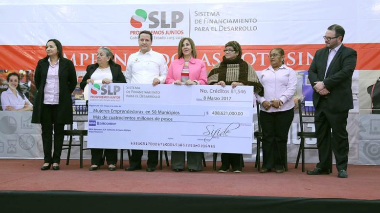 En un evento celebrado con 400 mujeres emprendedoras, con motivo del Día Internacional de la Mujer, Lorena Valle Rodríguez Presidenta de la Junta Directiva del Sistema Estatal DIF, anunció la entrega de financiamientos por 408 millones de pesos a más de 19 mil mujeres emprendedoras potosinas, como parte de los programas de financiamiento a través del SIFIDE.