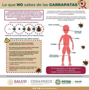 Actualmente se tienen detectados cinco casos de rikettsia en el municipio de Tamazunchale, en donde personal de zoonosis de la Jurisdicción Sanitaria VI ha realizado revisiones para identificar el vector o más posibles pacientes de la enfermedad y aplicado una campaña intensiva de desparasitación de mascotas, además de que en unidades médicas se ha dado capacitación al personal para mantener la vigilancia epidemiológica y detectar la rikettsiosis.