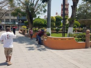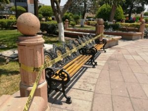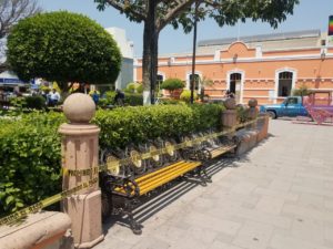 Las autoridades municipales llevaron a cabo la clausura temporal de espacios públicos durante esta mañana, personal de servicios municipales, de manera coordinada con funcionarios del Ayuntamiento, procedieron a la colocación de una cinta preventiva delimitadora, en color amarillo, en las bancas y alrededores de los jardines de la plaza principal, buscando con ello, el vitar que las personas puedan hacer usos de estos lugares.