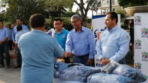 Fue al término de la ceremonia de honores a la bandera, efectuada este lunes en la explanada de la plaza principal, en donde el Presidente Municipal, Ramón Torres García, acompañado del Oficial Mayor del Ayuntamiento, Francisco Javier Esparza Pérez, así como del propio Secretario General del Sindicato, Andrés Blas Hernández, efectuó la entrega simbólica de estos apoyos.