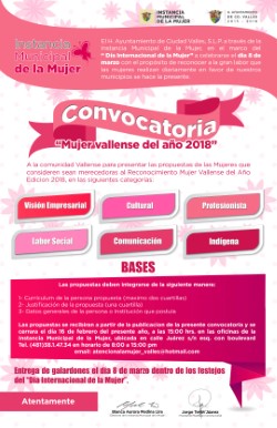 El Gobierno de Ciudad Valles a través de la Instancia Municipal de la Mujer, dio a conocer este miércoles por la mañana y en rueda de prensa la convocatoria “Mujer Vallense del año 2018”, con la finalidad de que se presenten antes del 16 de febrero las propuestas para recibir este reconocimiento en las categorías de: “Visión Empresarial”, “Cultural”, “Profesionista”, “Laboral Social”, “Comunicación” e “Indígena”, además se dieron a conocer los panelistas de un Foro que el día de la entrega de los galardones se presentará con panelistas nacionales y locales.