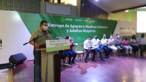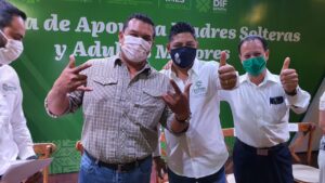 El alcalde Arnulfo Urbiola durante la entrega de becas económicas a madres solteras y a los adultos mayores, agradeció la presencia del gobernador del estado Ricardo Gallardo Cardona por el valioso apoyo.