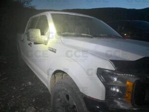 También se ubica una camioneta tipo pickup doble cabina marca Ford Lariat con placas de identificación del Estado de Florida; en el asiento del copiloto se localiza una persona del sexo femenino con un chaleco balístico en color negro y en el asiento del conductor se encontró una persona del sexo masculino, que de igual manera viste un chaleco balístico en color negro, localizando también un arma de fuego larga calibre 308 y una corta así como un arma corta tipo revólver, y múltiples cartuchos esparcidos sobre la alfombra calibre 308 y .223 estos últimos en la parte trasera.