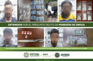 S.L.P.- Como resultado de la estrategia integral para el combate frontal a la delincuencia, agentes de la Guardia Civil Estatal (GCE) detuvieron a 8 presuntos narcomenudistas en diferentes operativos, logrando asegurar 80 dosis de enervantes.