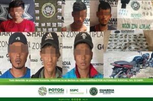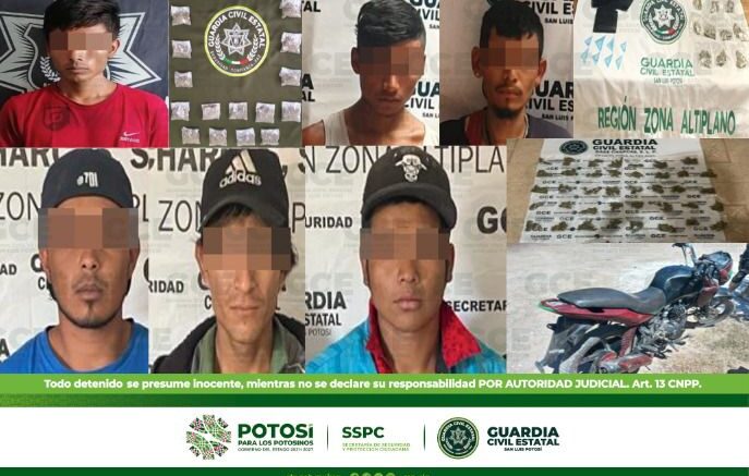 San Luis Potosí.- Como resultado de las acciones de seguridad trazadas en el Plan Integral de Seguridad para preservar la paz en el Estado, en diferentes acciones, agentes de la Guardia Civil Estatal (GCE), aseguraron 80 dosis de estupefacientes y detuvieron a 6 masculinos por presunta posesión de droga.