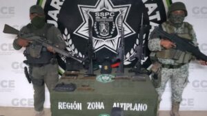 Matehuala, S.L.P.- Como resultado de los trabajos operativos de seguridad desarrollados por oficiales de Guardia Civil Estatal en coordinación con Ejército Mexicano, se aseguró una unidad en cuyo interior se descubrió armamento de grueso calibre, cargadores y cartuchos útiles, así como equipo táctico, procedente de una supuesta célula delictiva.