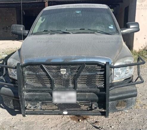 Guadalcázar, S.L.P.- Derivado de la estrategia de seguridad implementada en la zona Altiplano, para el combate frontal contra la delincuencia, agentes de la Guardia Civil Estatal (GCE) aseguraron una camioneta con reporte de robo reciente, varios poncha llantas y equipo táctico.