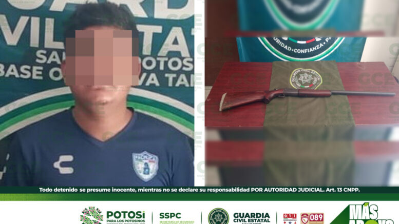 Tamuín S.L.P.- Agentes de la Guardia Civil Estatal dentro de sus tareas enfocadas a brindar mayor paz y tranquilidad a las familias de esta región, lograron la detención de un hombre que portaba un arma de fuego de manera irregular.