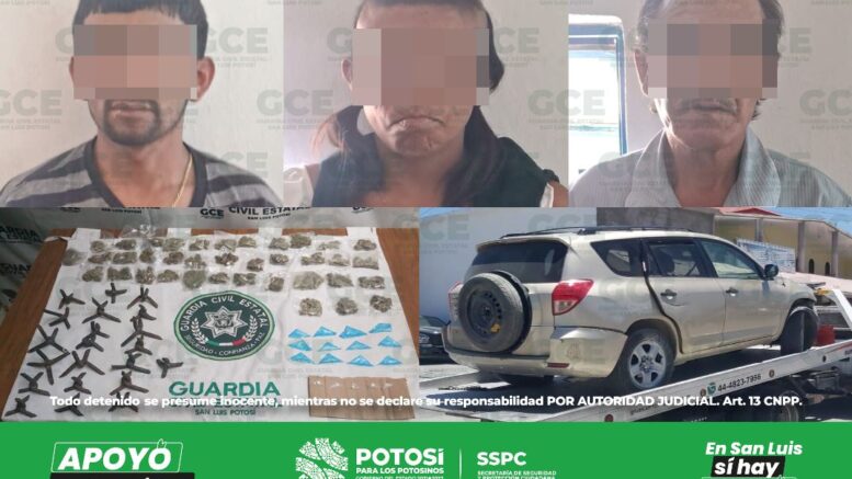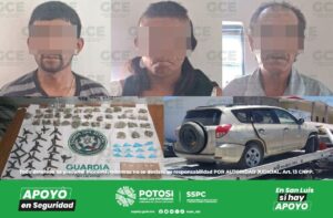 En la zona centro del municipio de Cedral, la GCE desarticuló una banda de supuestos vendedores de droga. Tras una persecución, los ocupantes de una camioneta arrojaron objetos “poncha llantas”, pero finalmente fueron detenidos. En la inspección se aseguraron 37 dosis de marihuana, 12 de “cristal”, 10 de crack y se recolectaron 21 “poncha llantas”. Jesús “N”, de 22 años, Deisi “N”, de 32 años, Emeterio “N”, de 57 años, y un joven de 16 años fueron arrestados, vinculados a una célula criminal generadora de violencia en la región Altiplano.