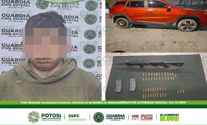 Villa de Reyes, S.L.P.- Oficiales de la Guardia Civil Estatal (GCE) desplegaron un operativo en el tramo carretero 37 Villa de Reyes-San Felipe, cuando tuvieron contacto con los ocupantes de un vehículo, uno de ellos detonó un arma de fuego contra los estatales, quienes repelieron la agresión y detuvieron a los presuntos criminales, asegurándoles un fusil de asalto.