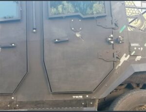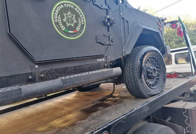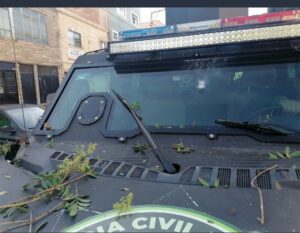 Al menos un vehículo de la Guardia Civil Estatal resultó con daños tras el reporte de una balacera en fraccionamiento Villa Magna.