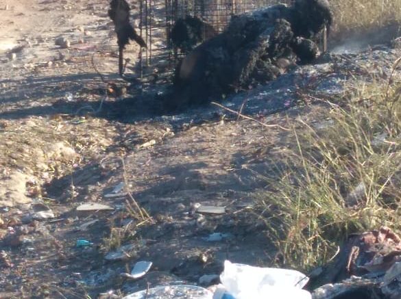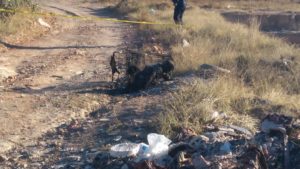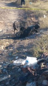 La persona calcinada sobre terracería aún costado un carrito de supermercado en el que posiblemente fue traspotado elementos de la Policía ministerial y peritos realizan las primeras investigaciones