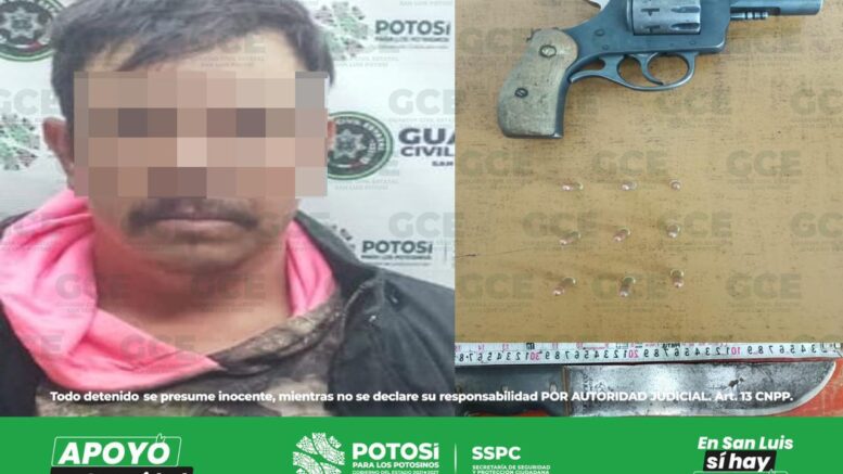 Mexquitic de Carmona, S.L.P.- Tras los operativos de seguridad y vigilancia que son implementados en la entidad potosina, se logró la detención de un hombre que presuntamente ingresó a una empresa armado con un cuchillo y arma de fuego. El detenido contaba con una orden de aprehensión vigente por el probable delito de feminicidio, en el estado de Zacatecas.