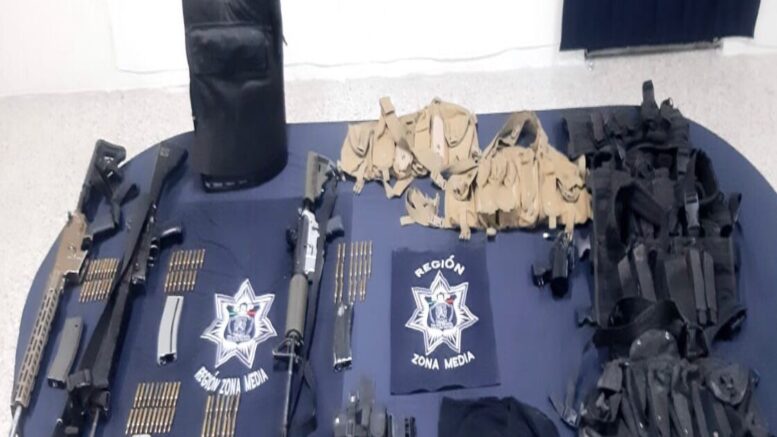 Cerritos S.L.P.- En seguimiento a la estrategia de seguridad e inteligencia para pacificar la Zona Media de San Luis Potosí y tras un despliegue de las fuerzas operativas de la Policía Estatal, detuvieron a tres sujetos como probables responsables de los delitos de portación de arma de fuego, cartuchos útiles y equipo táctico.