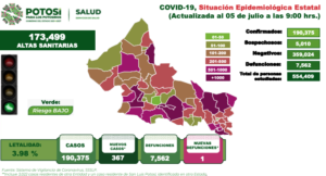 En cuanto al Informe Diario de casos Covid-19, se dan a conocer 367 nuevos contagios confirmados en la Entidad. De esta forma, el Comité Estatal para la Seguridad en Salud y los Servicios de Salud informan que, hasta este 6 de julio, se registran 190 mil 375 casos totales de este padecimiento.