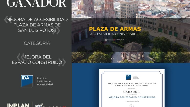 En la primera edición de los Premios del Instituto de Accesibilidad (IDA) 2023, el Instituto Municipal de Planeación (Implan), fue distinguido con el primer sitio, gracias al proyecto “Mejora de la Accesibilidad Plaza de Armas San Luis Potosí”, en la categoría “Mejora de un Espacio Construido”, entre más de 60 proyectos internacionales que participaron en estos reconocimiento del Instituto de Accesibilidad (IDA), institución española especializada y enfocada en la accesibilidad en América Latina.