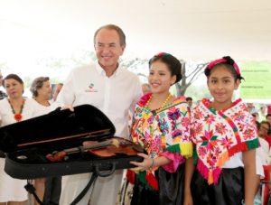 Tras agradecer a los habitantes de la zona y a la empresa CEMEX por su compromiso para impulsar obras y acciones a favor de los potosinos, el Gobernador del Estado aprovechó para hacer entrega de instrumentos musicales a los niños del Taller de Sones Huastecos