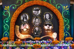 El altar monumental fue realizado por el personal de Palacio de Gobierno apoyado por el artista Eduardo Medina en homenaje a la Época de Oro del Cine Mexicano.