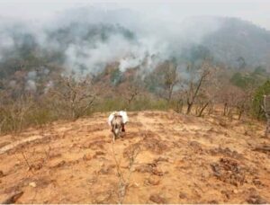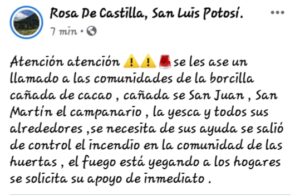 En el mensaje de ayuda de habitantes de Rosa de Castilla enclavado en lo alto de la sierra que colinda con el municipio de #Rioverde y #ciudad Fernández solicitan a las comunidades cercanas ayuda para realizar brigadas y entrar a la sierra donde el fuego se extiende rápido y fuera de control.