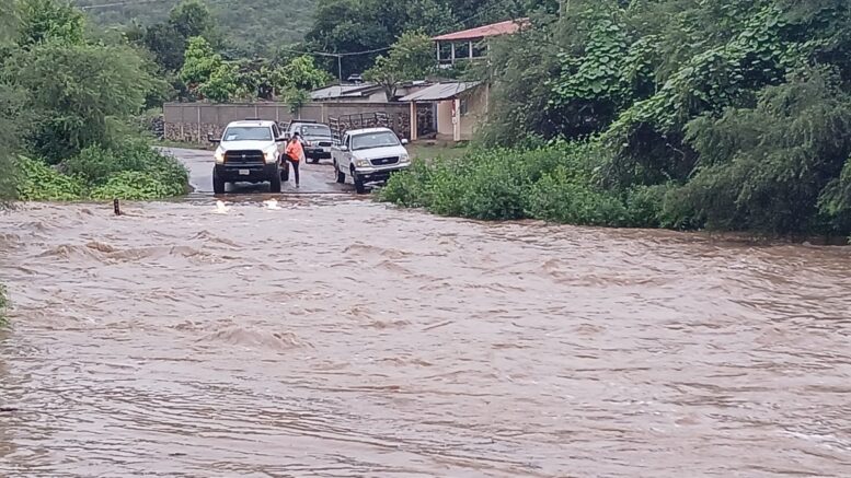 Rioverde, S.L.P., 9 de octubre de 2025.— Las intensas lluvias provocadas por dos tormentas tropicales en las últimas 24 horas han provocado la crecida significativa del arroyo El Zapote en el municipio de Rioverde, dejando a cerca de 300 familias incomunicadas desde la mañana de este jueves.